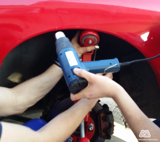 Ahora nos queda el último paso. La llave que hay encima del buje cuyos extremos tiene dos protectores de plástico es la que aplica la fuerza. Antes de aplicar fuerza, calentaremos con una pistola de calor todo el borde exterior de la aleta, para que de esta forma, la pintura no salte. Es muy importante este paso, aunque la realización del mismo, no nos asegura que no vaya a saltar algo de pintura (especialmente, si la pintura del coche es de origen y tiene ya muchos años a sus espaldas, o alguna reparación anterior en ese punto concreto).