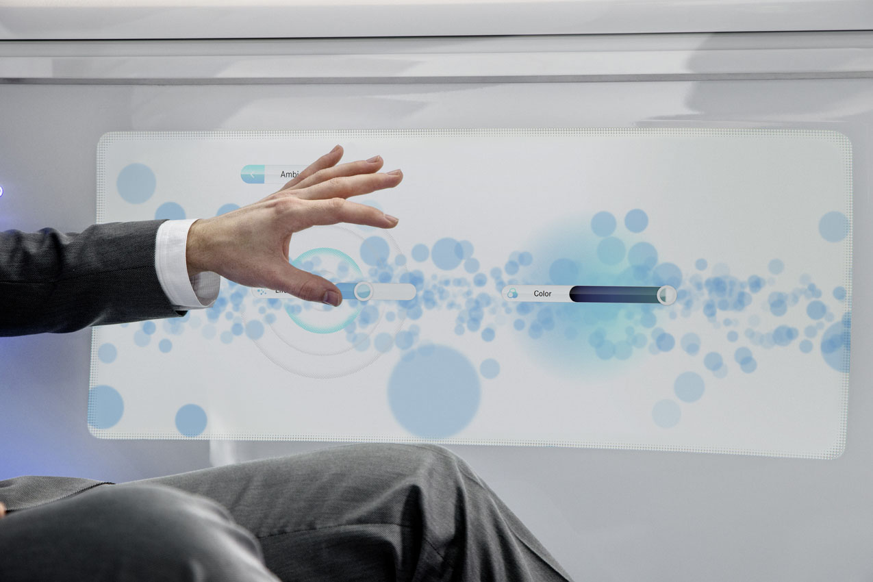 Mercedes-Benz F 015 Luxury in MotionDie Partikelströme auf den Displays �?? mit strahlend wei�?er Hintergrundgrafik �?? visualisieren die Bewegung des Fahrzeugs und symbolisieren seine IntelligenzParticle streams on the displays �?? with brilliant white background graphics �?? visualise the vehicle’s movement and symbolise its intelligence