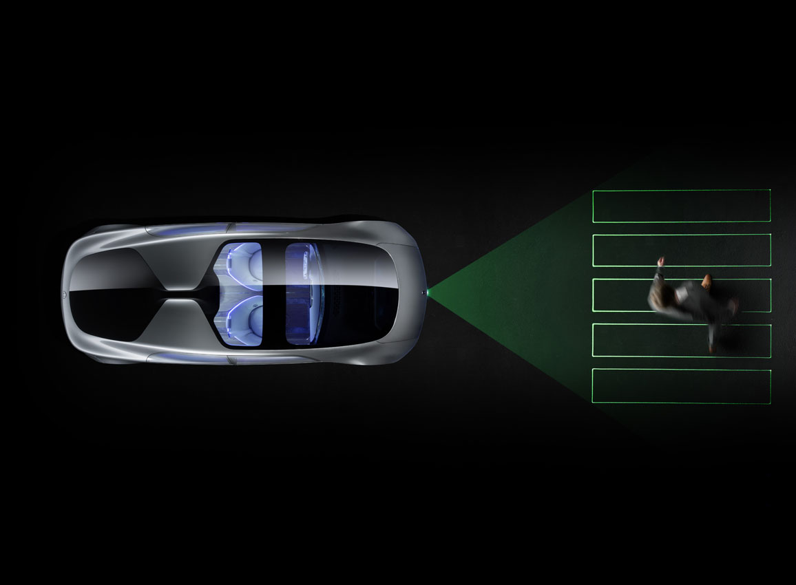 Mercedes-Benz F 015 Luxury in MotionMit seinem hochpräzisen Laser-Projektionssystem kann das Fahrzeug wichtige Informationen in einem breiten Lichtkegel auf die Stra�?e vor ihm projizieren. Zum Beispiel einen virtuellen Zebrastreifen, um Passanten am Stra�?enrand zu signalisieren, dass ein �?berqueren der Stra�?e gefahrlos möglich istThe high-precision laser projection system allows the the vehicle to project a broad cone of light onto the road in front showing important information. For example, a virtual zebra crossing indicating to pedestrians on the side of the road that it is safe to cross