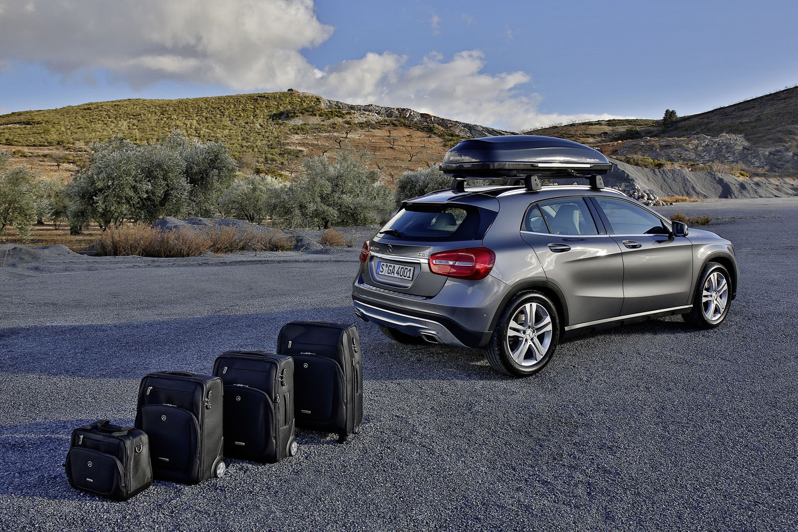 Mercedes-Benz Accessories, Zubeh�?¶r GLA-Klasse: Multifunkionaler, abschlie�?źbarer Aluminiumtr�?¤ger mit neuentwickeltem Aeroprofil aus dem Flugzeugdesign, das Windger�?¤usche sp�?Ľrbar reduziert. Montage via Schnellspannmechanismus ohne zus�?¤tzliches Werkzeug. Mercedes-Benz Dachbox 400, Volumen ca. 400 Liter, mit Griffleiste zum leichteren �?�??ffnen und Schlie�?źen. Erh�?¤ltlich in Mattsilber und Schwarzmetallic. Koffer aus der Serie Samsonite X-Pression und Samsonite Beautycase.
