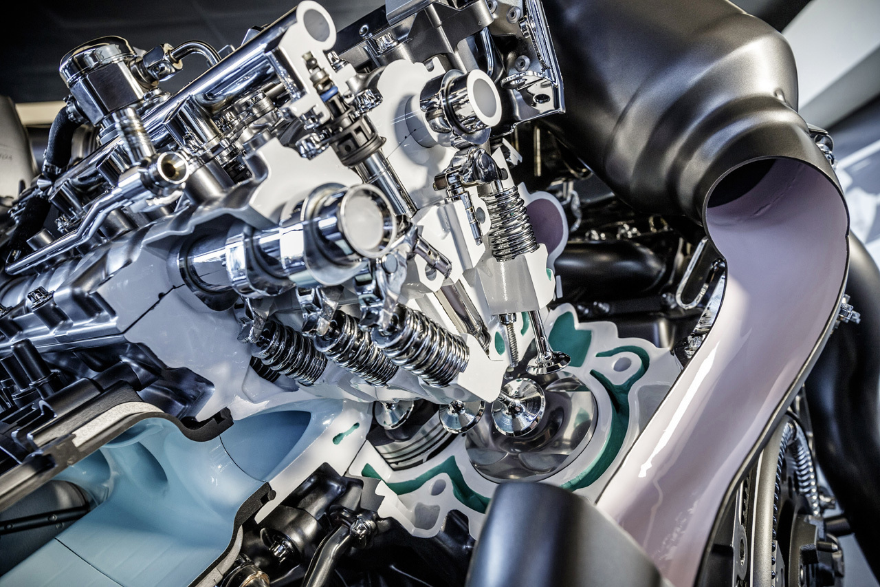 AMG 4.0-Liter V8 Biturbo-Motor (M 178); reibungsoptimierte Ventiltrieb mit Rollenschlepphebeln und die optimierten Ventilfedern ;AMG 4.0-Liter V8 Biturbo-Motor (M 178); low-friction piston ring package;