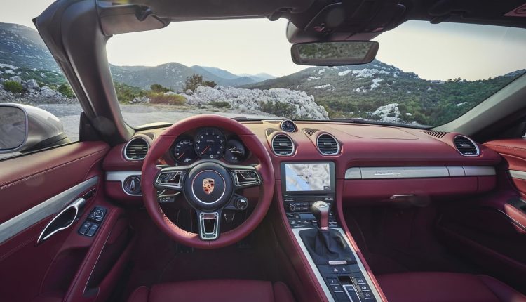 Su habitáculo nos recibe con una piel burdeos con molduras en aluminio, como guiño también al prototipo original. El volante deportivo GT con calefacción, asientos con reglajes eléctricos, paquete interior aluminio y la inscripción Boxster 25 en el umbral de las puertas son parte de la dotación de serie.