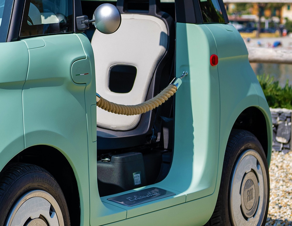 Además del frontal, también podemos ver algunos otros detalles exclusivos de esta iteración de Fiat, tales como los tapacubos retro o el color exterior menta. Además, el techo es de lona retráctil y por lo que se ve en las imágenes, en esta unidad en concreto es de color marrón.